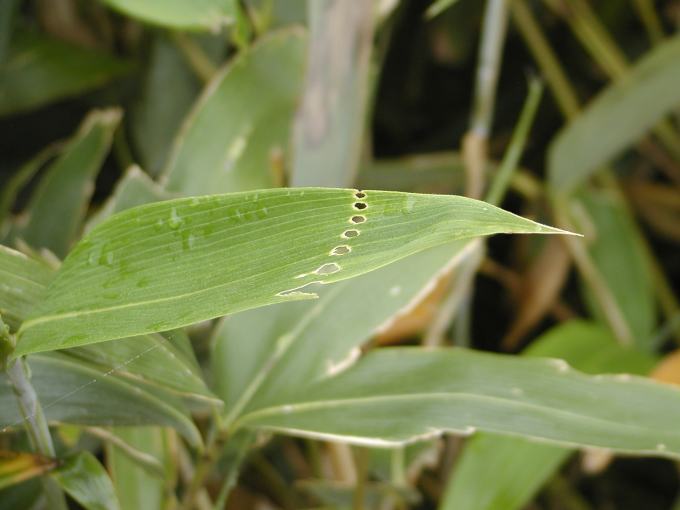 まだ葉っぱが丸まっているときに、小さな虫が食べ