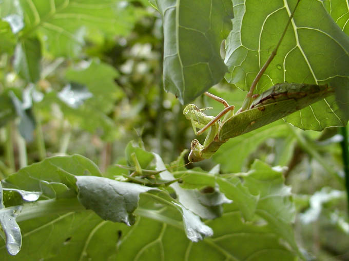ブロッコリーの葉の裏で逆さま。目線の先にはおんぶバッタがいるのですが
