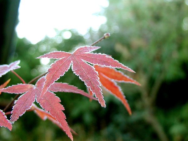 朝 霜が降りて、庭のモミジが白くお化粧していました。