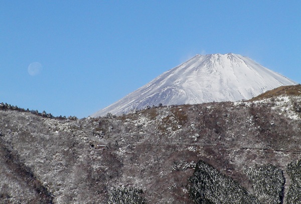 富士山の横に、まだ月がうっすらと見えています。