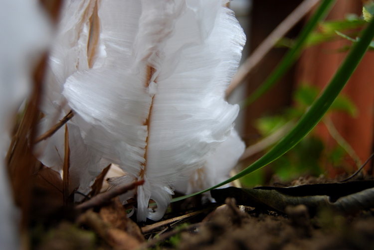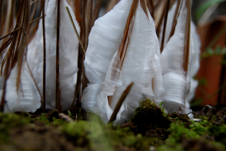 とても寒い朝、シモバシラの根本に氷の花が開きました